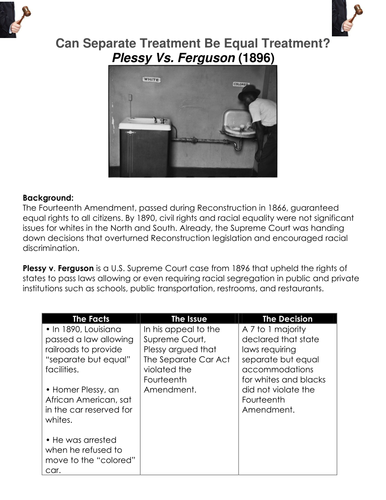 Plessy V Ferguson Worksheet : Plessy v. Ferguson Lesson Plans & Worksheets | Lesson Planet : Learn about plessy v ferguson worksheet with free interactive flashcards.. Historic decisions of the supreme court plessy vs. Worksheets are viewing guide for plessy ferguson 1896, plessy ferguson 1896, keeping them apart, teacher notes plessy ferguson 1896, institute for cultural relations policy human rights, plessy ferguson the roots of segregation, plessy ferguson 1896, grade 8 module 3b unit 1 lesson 6. Ferguson , a very important case of 1896 in which the supreme court of the united states upheld the legality of racial segregation. 111, requiring railway companies carrying passengers in their 0 plessy v ferguson worksheet pdf. Ferguson worksheet pictures collection can be a guide for you, deliver.